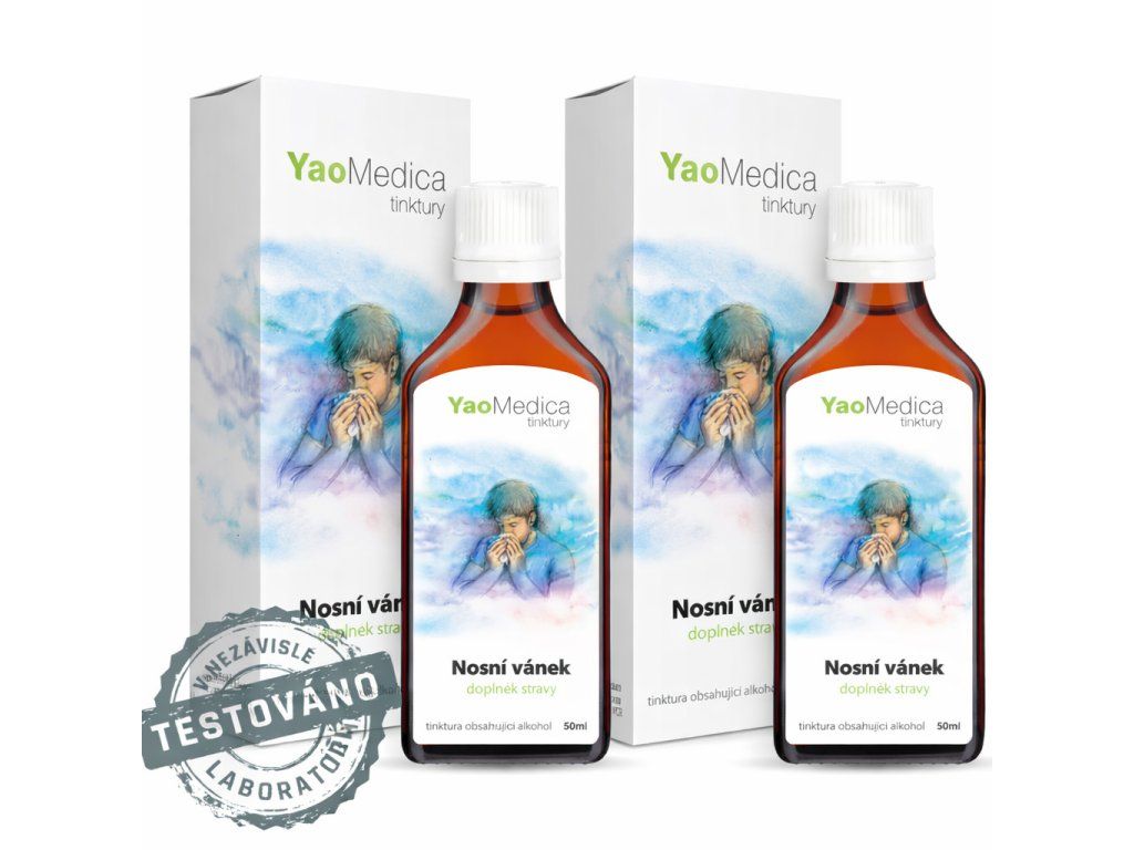 Alkoholová tinktura YaoMedica Nosní vánek je česká, přírodní směs čínských bylin podle receptury Bi Yan Wan, připravená macerací v 50% lihu pro intenzivní uvolnění účinných látek. Určeno pro dospělé, užívá se na lačno (1 kapka/1 kg tělesné hmotnosti, ráno a večer). Balení 2 × 50 ml obsahuje cca 2200 kapek; nevhodné pro těhotné a kojící ženy. Není náhradou stravy.