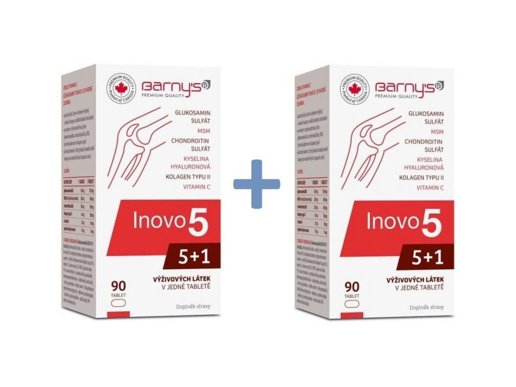 Barny´s Inovo 5 pro klouby představuje komplexní mix 5+1 výživových látek stanovené předními kanadskými specialisty: glukosamin sulfát, MSM, chondroitin sulfát, kyselina hyaluronová, kolagen typu II. a vitamin C pro normální funkci chrupavek a kostí.