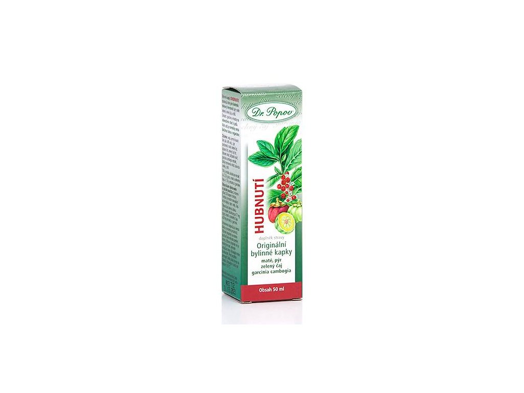 - Originální bylinné kapky Dr. Popova Hubnutí obsahují byliny pro kontrolu tělesné hmotnosti: pýr, maté zelené, zelený čaj a chilli. Extrakt z garcinie je vhodný k omezení chuti k jídlu. Maté udržuje normální metabolismus tuků v organismu.
