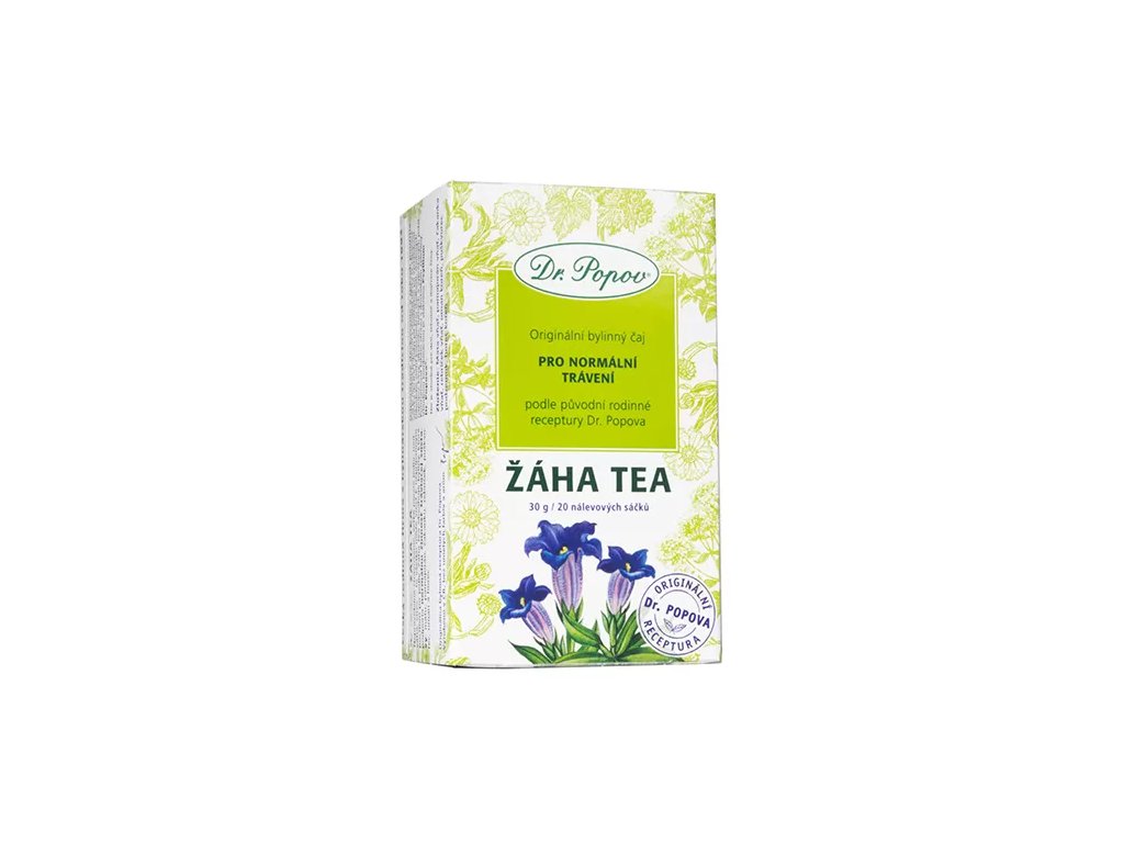 Bylinný čaj Dr. Popova Žáha tea obsahuje tradičně užívané byliny podporující zdravé trávení: máta peprná se podílí na správné činnosti trávicí soustavy a střev a osvědčila se při nadýmání. Také všechny ostatní obsažené byliny (hořec, dobromysl, čekanka, oman, puškvorec) udržují trávení v dobrém stavu.