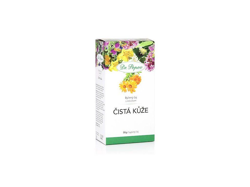 Bylinný čaj Dr. Popova Čistá kůže obsahuje kombinaci 9 výborných bylin, z nichž se zejména lopuch, rozrazil a měsíček podílí na zdravém stavu pokožky a zároveň přispívají i k jejímu hojení.