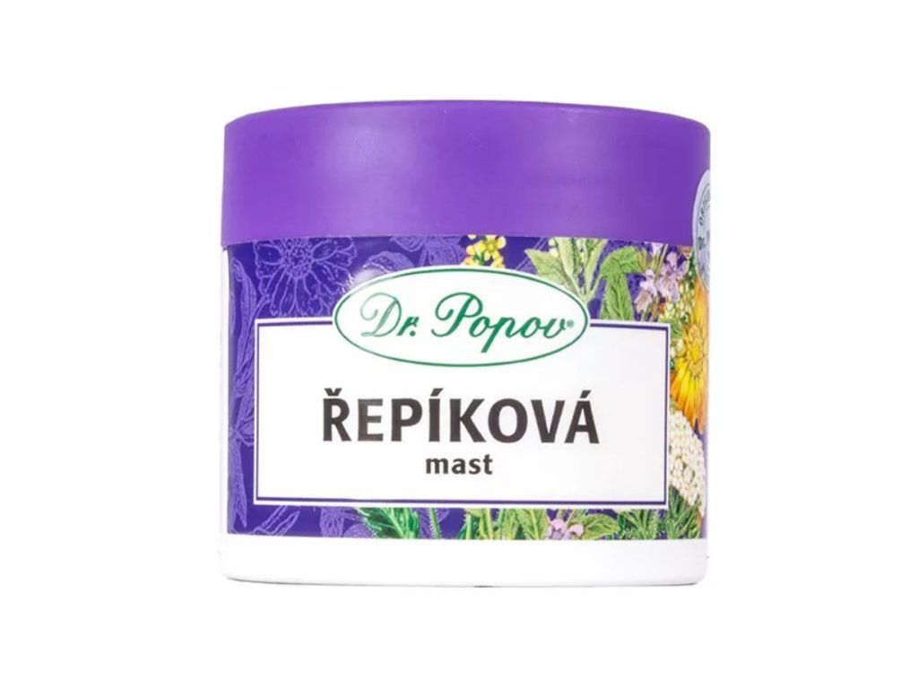 Řepíková mast Dr. Popov je tradiční bylinná mast na drobná mechanická poranění. Obsahuje řepík, heřmánek, šalvěj a tymián v nosiči z čištěného vepřového sádla a včelího vosku, což podporuje hojení a vytváří ochranný hydratační film. Produkt neobsahuje konzervanty ani umělá barviva a je dodáván v praktickém plastovém balení 50 ml.