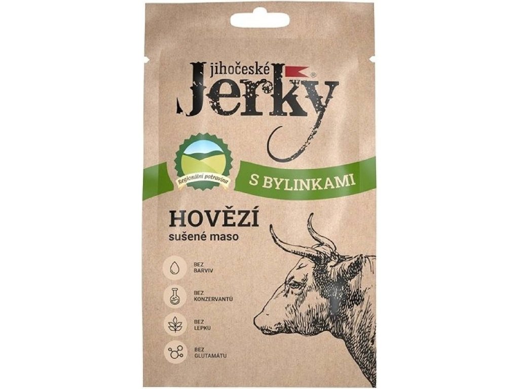Sušené maso, jerky z hovězí maso s bylinkami jemně ochucené solí. Bohaté na proteiny, mimořádně lahodné chutě. Lahodná svačinka, když vás dožene malý hlad.