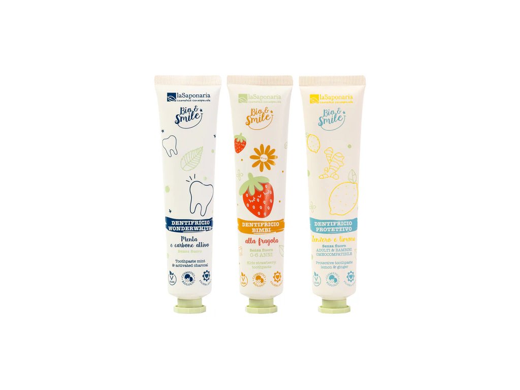 Hvězdné trio zubních past od italské značky laSaponaria potěší všechny členy domácnosti. Unikátní černá pasta WonderWhite s aktivním uhlím provane ústa svěží mátovou chutí, vybělí tesáky a zbaví je nežádoucího zabarvení. Pasta s citrónem a zázvorem má příjemně nasládlou kořenitou chuť a schopnost jemně čistit, chránit zuby a ústní dutinu. Dětská pasta s chutí pravých jahod přiměje k zubní hygieně i ty nejzarytější malé odpůrce. Ani v jedné z past nenajdete fluorid sodný. Jejich šetrné zpracování a BIO kvalitu garantuje italský certifikát CCPB Cosmetici Biologici.