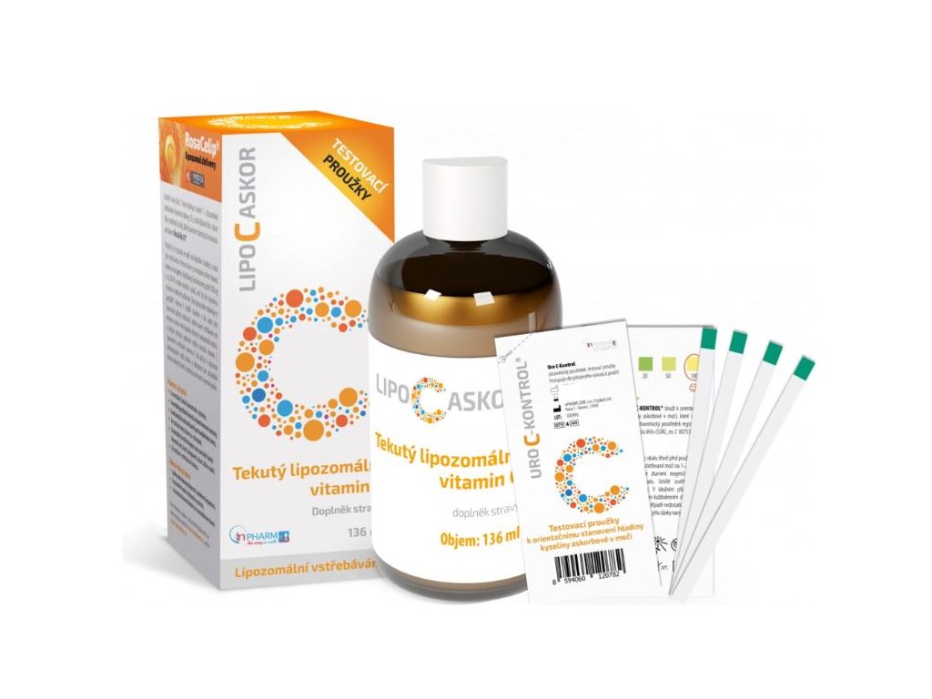 Balení obsahuje tekutý lipozomální vitamin C (136 ml) a testovací proužky URO C‑KONTROL (4 ks), které slouží k orientačnímu zjištění hladiny vitaminu C v moči.