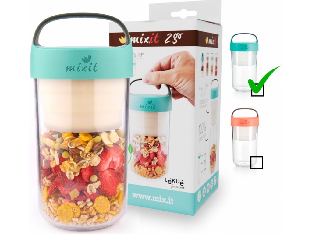 Novinka! Vezměte si svůj Mixit kamkoliv! Svačinový box Mixit 2go v krásné mentolové barvě je skvělý parťák do práce, do školy nebo na výlet. Do horní mističky si můžete dát jogurt, mléko, vodu nebo třeba čerstvé ovoce. Do spodní si nasypte svůj oblíbený mix, kaši, lyo ovoce nebo oříšky, zkrátka cokoliv máte rádi. A v mžiku jste připraveni na mlsáníi!
