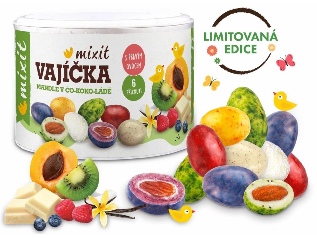 Veselá Veli-koko-noční limitovaná edice Mixit vajíček je zpět! Mixit slepičky opět snesly ta nejlahodnější čokoládová vajíčka. Uvnitř každého vajíčka najdete křupavou mandli obalenou v bílé čokoládě, ochucenou lyofilizovaným ovocem a dalšími přírodními ingrediencemi. A jak už je u nás zvykem, jsou bez umělých barviv a palmového oleje. Veli-koko-noce jsou připraveny na koko-ledníky!