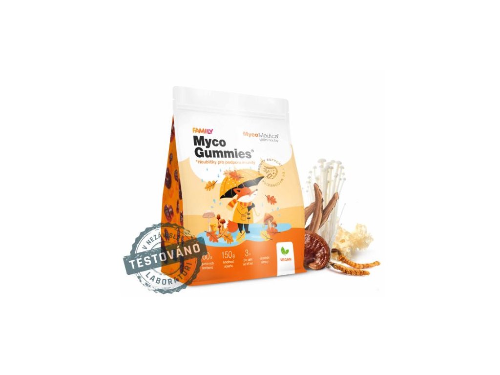 MycoMedica MycoGummies jsou veganské želé bonbonky se směsí 10 vitálních hub pro každodenní doplnění imunity a vitality. Jedna houbička obsahuje 10 extraktů po 25 mg (celkem 250 mg), je bez cukru, laktózy, barviv a konzervantů a užívá se 1–2 denně; skladujte v chladu, suchu a temnu.