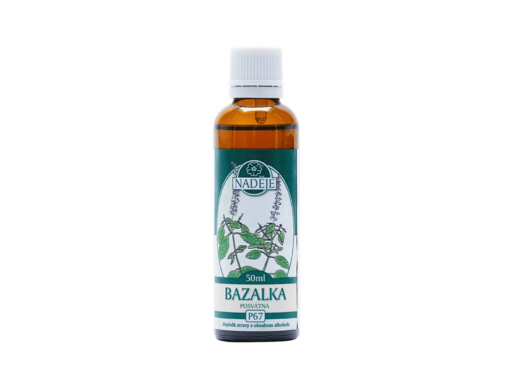Bazalka pomáhá udržovat optimální mentální i fyzický stav, blahodárně působí na dýchací systém, zklidňuje jej při podráždění. Povzbuzuje srdeční funkci, krevní oběh, mozkovou činnost, vitalitu a odolnost vůči stresu. Posiluje imunitní systém, jako antioxidant chrání buňky vůči oxidačnímu poškození. Přispívá k relaxaci a k dobrému spánku. Doplněk stravy s obsahem alkoholu.Složení: voda, alkohol 40 % obj., glycerin, bazalka posvátná pupenyDoporučené dávkování: Po protřepání 1 kapku na 1 kg tělesné hmotnosti za den, rozdělit na 2 až 3 dílčí dávky. Denní dávka 70 kapek při tělesné hmotnosti 70 kg odpovídá extraktu z 80 mg čerstvé hmoty pupenů.Upozornění: Není určeno pro děti, těhotné a kojící ženy. Nepřekračujte doporučené denní dávkování. Nenahrazuje pestrou a vyváženou stravu a zdravý životní styl. Případný zákal není na závadu.Skladování: Uchovejte mimo dosah dětí. Skladujte při teplotě do 28° C.Hmotnost: 50mlVýrobce: Mgr. Jarmila Podhorná, 798 46 Brodek u Konice 3