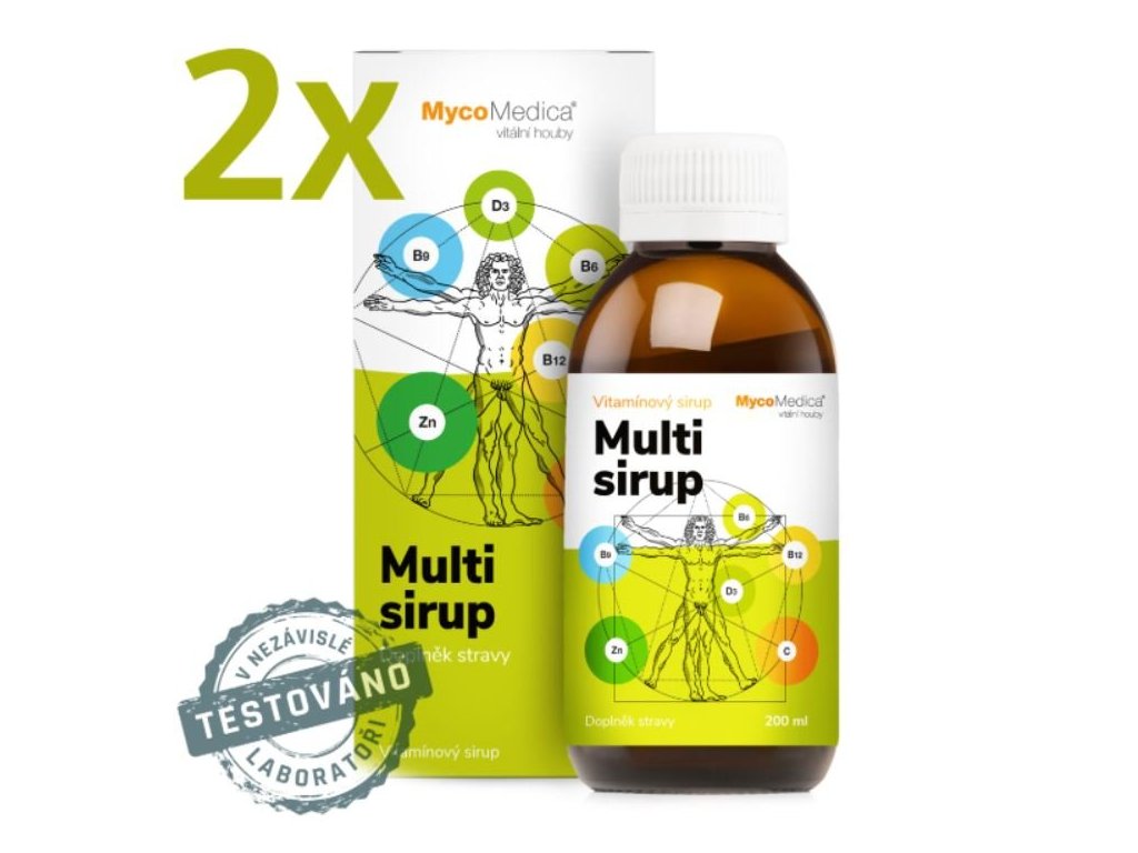 Multi sirup 2 x 200ml MycoMedica Multi sirup je vitamínový doplněk obsahující důležité vitamíny: C, D3, B6, B9, B12 a zinek. Díky této kombinaci působí antioxidačně a podporuje přirozenou obranyschopnost organismu.
