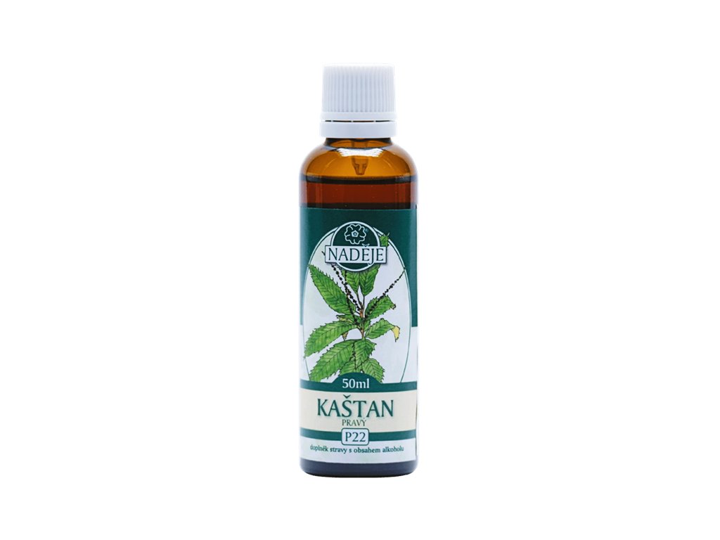 Kaštan pomáhá udržovat dobře pohyblivé, pružné klouby, přispívá k rovnováze bakteriální mikroflóry, podporuje střevní funkce a fyziologické pročišťování kůže. Doplněk stravy s obsahem alkoholu.Složení: voda, alkohol 40 % obj., glycerin, kaštanovník setý pupenyDoporučené dávkování: Po protřepání 1 kapku na 1 kg tělesné hmotnosti za den, rozdělit na 2 až 3 dílčí dávky. Denní dávka 70 kapek při tělesné hmotnosti 70 kg odpovídá extraktu z 80 mg čerstvé hmoty pupenů.Upozornění: Není určeno pro děti, těhotné a kojící ženy. Nepřekračujte doporučené denní dávkování. Nenahrazuje pestrou a vyváženou stravu a zdravý životní styl. Případný zákal není na závadu.Skladování: Uchovejte mimo dosah dětí. Skladujte při teplotě do 28° C.Hmotnost: 50mlVýrobce: Mgr. Jarmila Podhorná, 798 46 Brodek u Konice 3