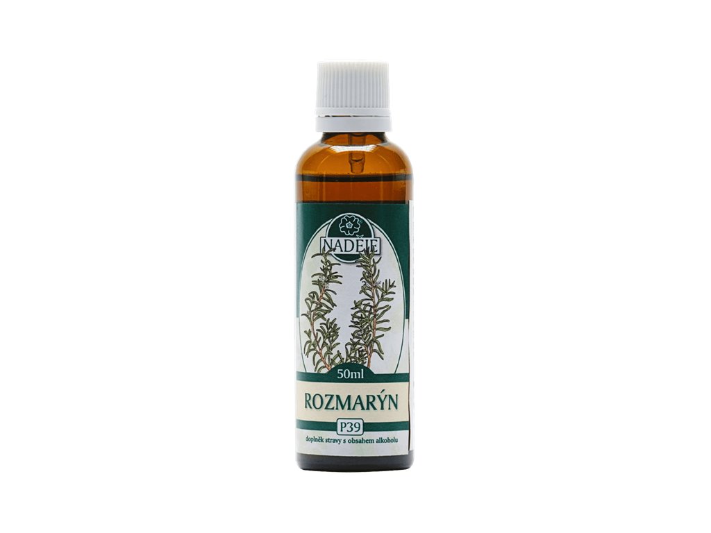 Rozmarýn chrání játra před působením toxických látek, podporuje jaterní činnost, pomáhá udržovat pročišťovací funkce. Stimuluje tvorbu trávicích šťáv a žluči, usnadňuje trávení tuků. povzbuzuje přirozenou obranyschopnost a imunitní systém. Doplněk stravy s obsahem alkoholu.Složení: voda, alkohol 40 % obj., glycerin, rozmarýn lékařský pupenyDoporučené dávkování: Po protřepání 1 kapku na 1 kg tělesné hmotnosti za den, rozdělit na 2 až 3 dílčí dávky. Denní dávka 70 kapek při tělesné hmotnosti 70 kg odpovídá extraktu z 80 mg čerstvé hmoty pupenů.Upozornění: Není určeno pro děti, těhotné a kojící ženy. Nepřekračujte doporučené denní dávkování. Nenahrazuje pestrou a vyváženou stravu a zdravý životní styl. Případný zákal není na závadu.Skladování: Uchovejte mimo dosah dětí. Skladujte při teplotě do 28° C.Hmotnost: 50mlVýrobce: Mgr. Jarmila Podhorná, 798 46 Brodek u Konice 3