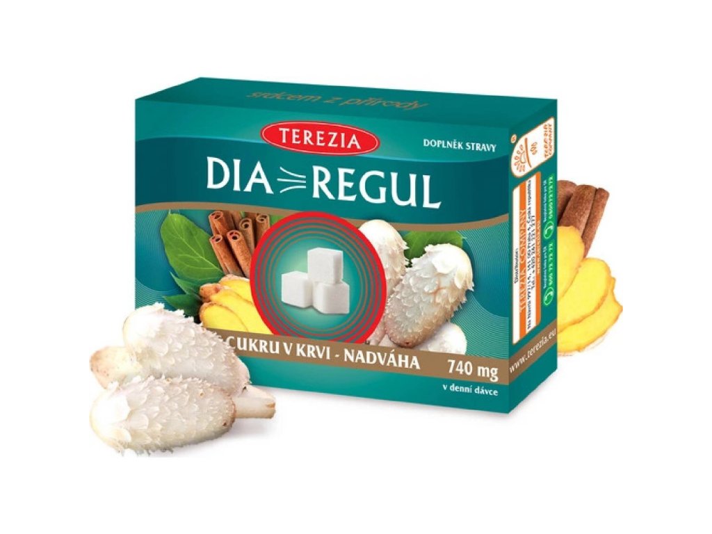 Složení 1 kapsle obsahuje 370 mg směsi DIAREGUL [prášek sušené lyofilizované houby hnojníku obecného (Coprinus comatus) 170 mg, gymnéma lesní (Gymnema sylvestre) extrakt 150 mg, sušený zázvor (Zingiber officinale) 29 mg, sušená skořice (Cinnamomum zeylanicum) 20 mg, pikolinát chromitý].